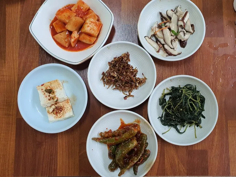 식사를 주문하고 기다리는 동안 6가지 밑반찬이 차려졌습니다.