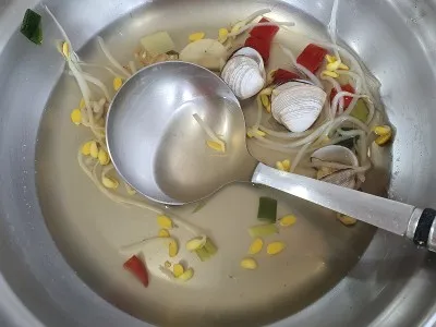 나룻터식당의 콩나물탕은 콩나물에 바지락과 명태포까지 냄비가 넘칠 만큼 푸짐하게 나옵니다.