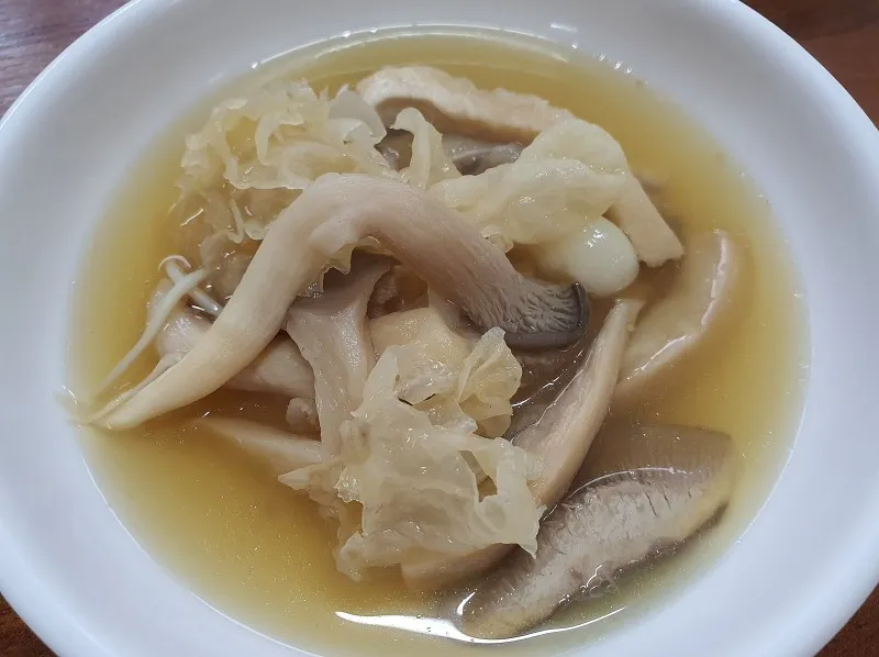 맑은 육수에 국내산 목이버섯, 팽이버섯, 느타리버섯과 귀하다는 황금버섯이 가득, 보양식을 대접받는 기분입니다.