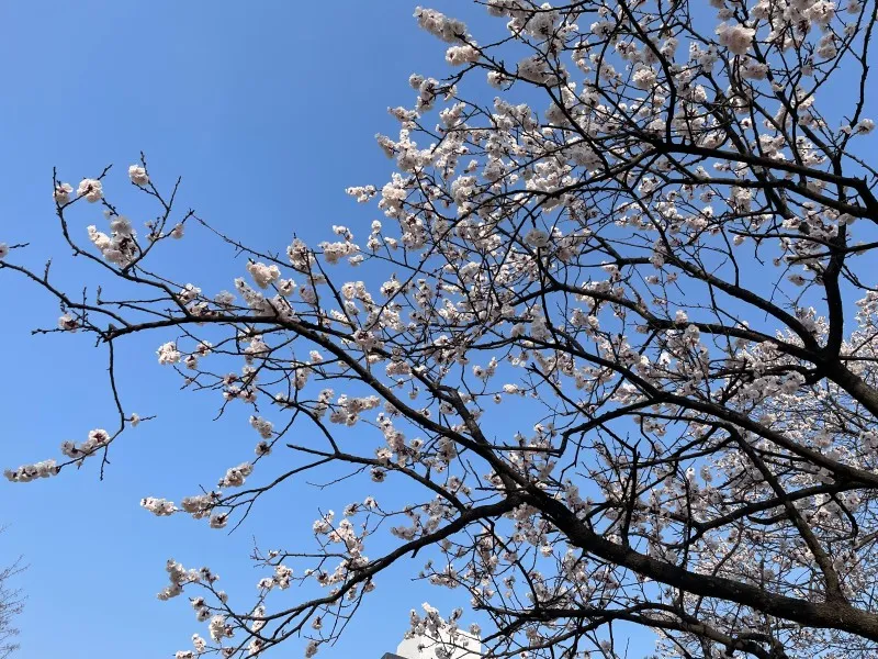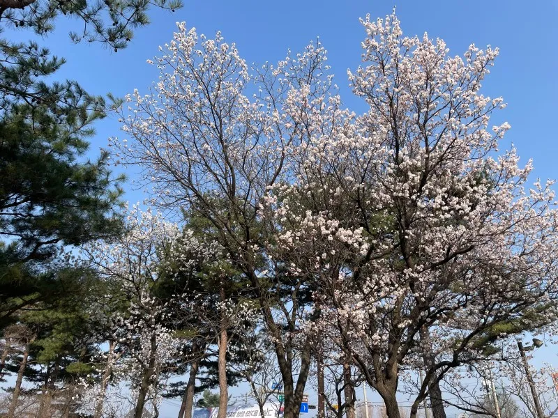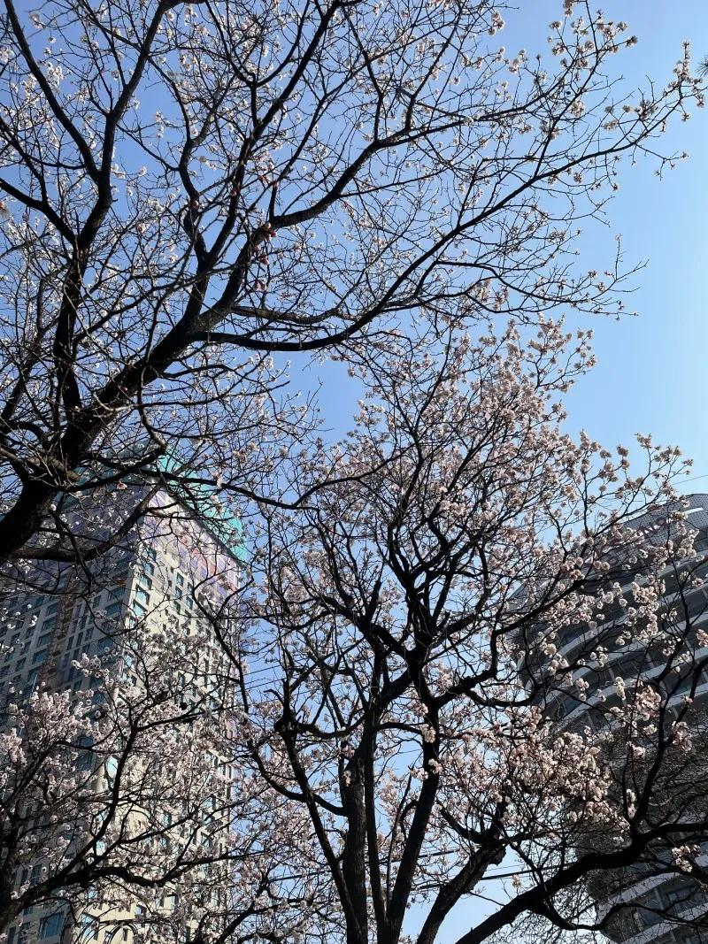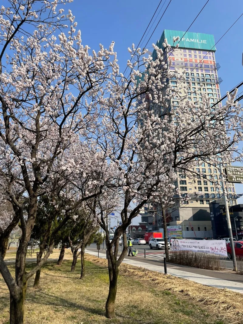 잭슨나인 호텔 바로 앞, 벚꽃길에 벚꽃이 폈어요.