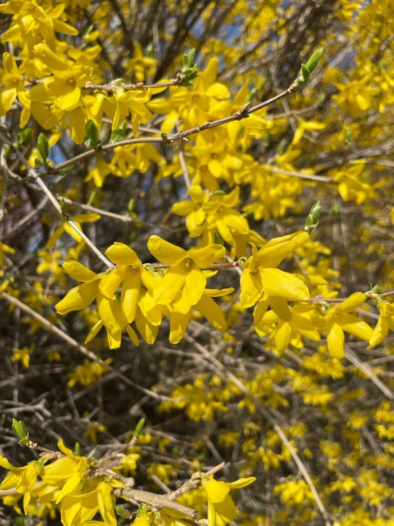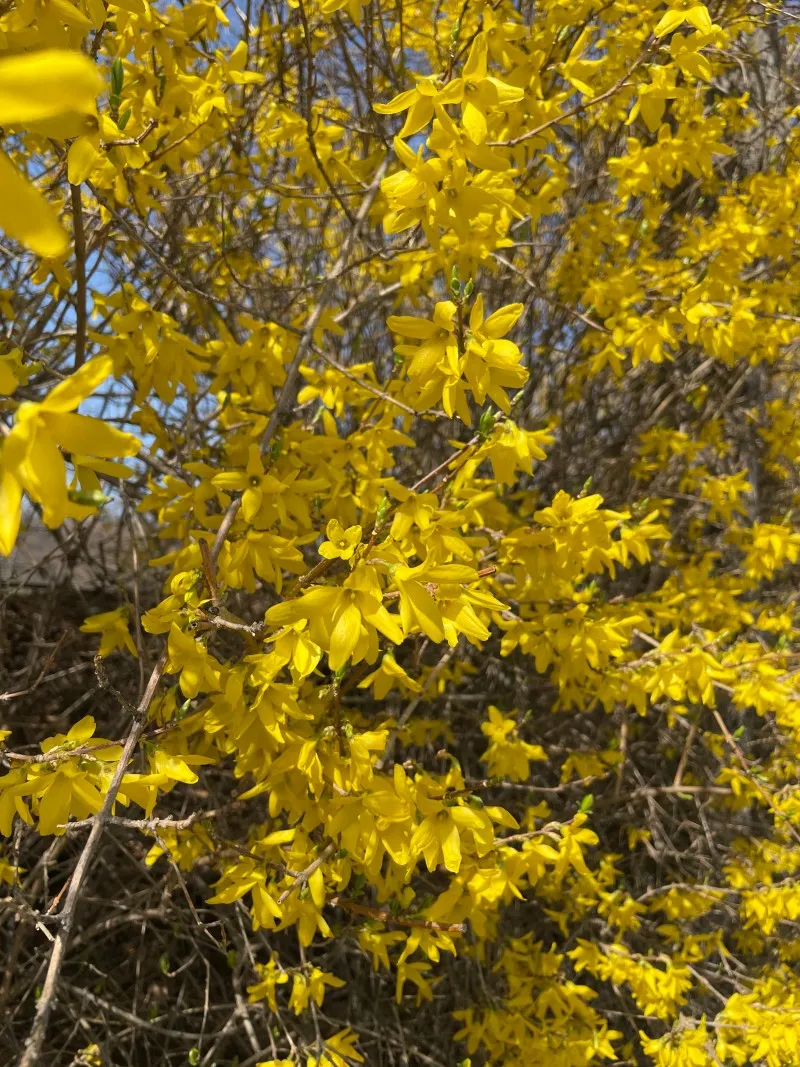 노오란 개나리꽃이 산책로에서 반겨주고 있어요.