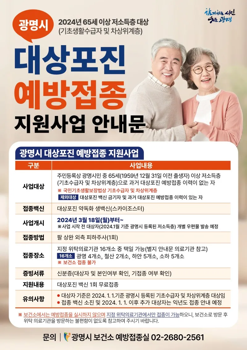 광명시가 감염병으로부터 어르신의 건강을 보호할 수 있도록 65세 이상 저소득층 대상포진 무료 예방접종을 지원합니다.