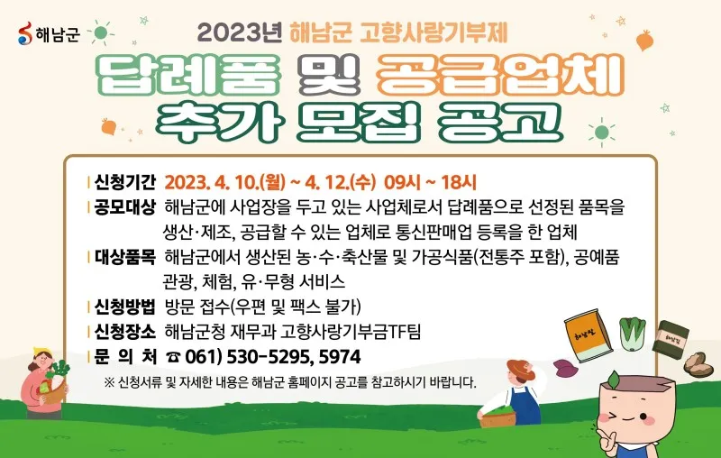 고향사랑기부제 답례품 및 공급업체 추가 모집 공고 [해남군]