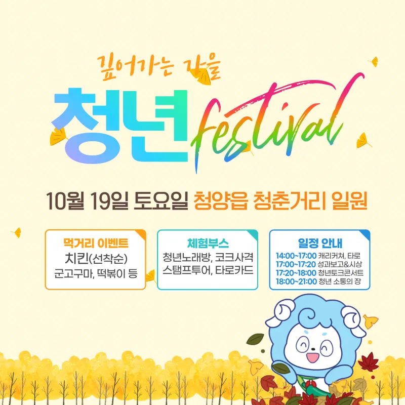 웰로1년 전깊어가는 가을, 청춘거리에서 '청춘페스티벌'에서 만나요~! 깊어가는 가을, 청춘거리에서 #청춘페스티벌 에서 만나요~! 10월 19일 토요일, 청양읍 #청춘거리에서 놀러 오세요~ 먹거리 이벤트 #치킨(선착순), 군고구마, 떡볶이, 순대, 오뎅, 마늘청 만들기 체험 #체험부스 이벤트 에어바운스, 풍선터트리기, 코크사격, 청년노래방, #스탬프투어, 타로카드, 캐리커쳐, 인생네켓 일정 안내 시간 내용 14:00~17:00 캐리커쳐, 타로 17:00~17:20 성과보고 및 시상 17:20~18:00 청년 토크 콘서트 18:00~21:00 청년 소통의 장(치킨 파티) {"title":"깊어가는 가을, 청춘거리에서 '청춘페스티벌'에서 만나요~!","source":"https://blog.naver.com/cheongyange/223622914549","blogName":"청양군 공..","blogId":"cheongyange","domainIdOrBlogId":"cheongyange","nicknameOrBlogId":"청양군","logNo":223622914549,"smartEditorVersion":4,"meDisplay":true,"lineDisplay":true,"outsideDisplay":false,"cafeDisplay":false,"blogDisplay":false} #청춘페스티벌#청춘거리에서#치킨#체험부스#스탬프투어출처:https://blog.naver.com/cheongyange스크랩