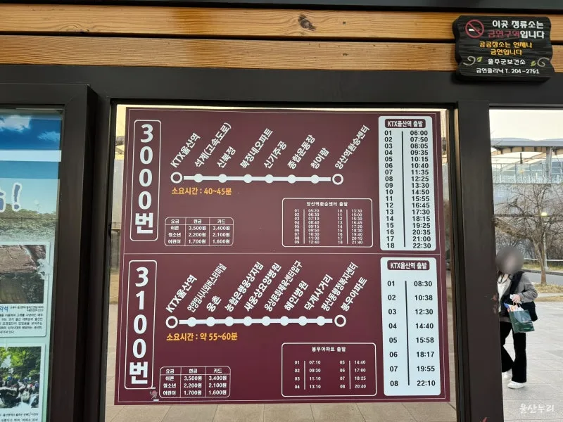 출발시간도 상세히 기재되어 있습니다. 예를 들어 울산역에 도착해 웅촌으로 간다면 3100번을 탑승하시면 되겠죠.