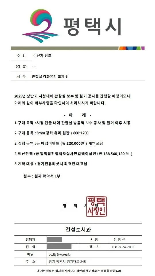 건설도시과 직원 사칭자가 위조 공문서를 사용해 “강화유리 제작 및 대리구매”를 요청하고,
