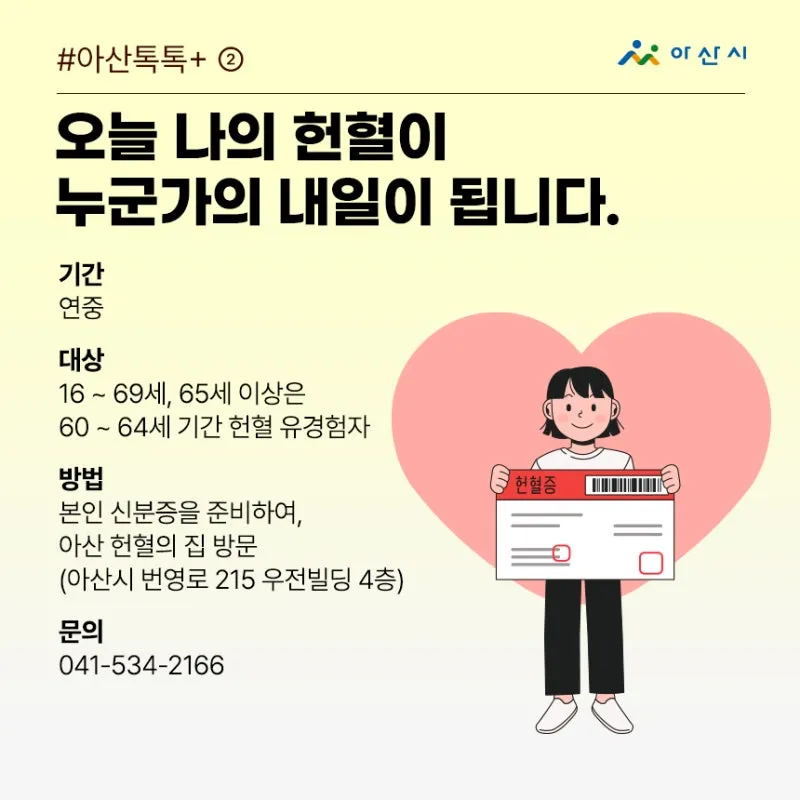 방법 : 본인 신분증을 준비하여, 아산 헌혈의 집 방문