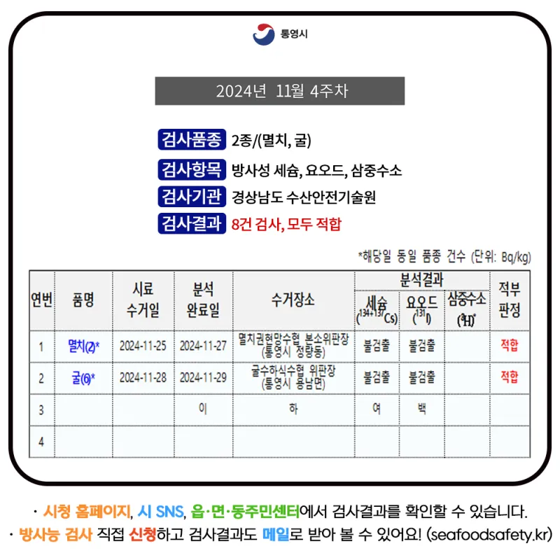 안전한 통영 수산물, 방사능 검사 결과로 말합니다! 2024년 11월 4주차