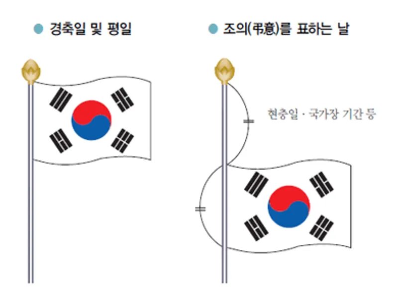 ※ 아파트 등 고층건물에서는 강풍 등으로 난간 등에 단 태극기가 떨어져 사고로 이어지지 않도록 주의해주시기 바랍니다.