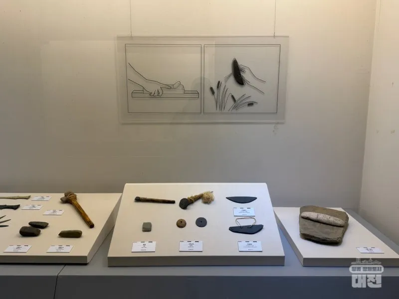 신석기 시대의 사람들은 물을 이용하기 좋은 바닷가나 큰 강가 주변에서 생활했습니다. 대전 지역에서는 갑천 유역을 중심으로 신석기 유적이 발견되었으며, 전시실에는 보습, 갈돌, 어망추, 그리고 대표적인 빗살무늬 토기 등이 전시되어 있습니다. 이러한 유물들은 자연에서 한정된 자원을 채집하거나 사냥에 의존하던 생활 방식에서 벗어나, 인간 스스로 먹거리를 생산해내는 농경 생활의 시작을 보여줍니다.