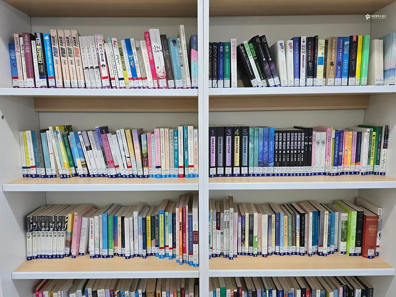 키 낮은 입체형 책장에 가득 준비되어 있는데요.