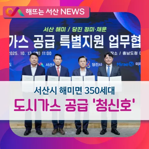 서산시, 해미면 350세대 도시가스 공급 ‘청신호’- 13일 충청남도·미래엔서해에너지와 도시가스 공급 특별지원 업무협약 -- 해미면 반양1리, 동암리, 조산리 일원 12.54㎞ 규모 도시가스 배관 구축 -충남 서산시가 지역 에너지복지 향상과 시민의 난방비 부담 완화에 총력을 기울인다. 시는 13일 충남도청 대회의실에서 ‘소외지역 도시가스 공급 특별지원 업무협약’을 체결했다고 밝혔다. 이날 협약식에는 이완섭 서산시장, 김태흠 충남도지사, 송민섭 미래엔서해에너지 대표 등이 참석했다. 협약은 경제성이 낮아 도시가스 공급이 지연되고 있는 ...
