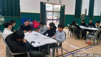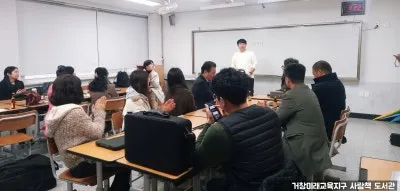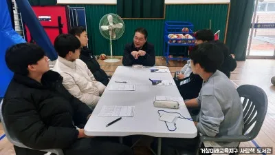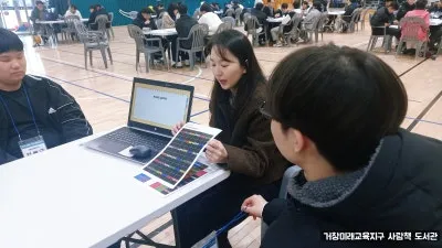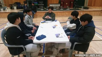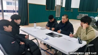 11월 27일 대성중학교 체육관과 중3 교실에서 1,2부로 나뉘어 120분간 사람책 도서관이 진행되었어요. 대출 전 당일 대출 예정인 사람책들이 모여 사전 점검을 해요.