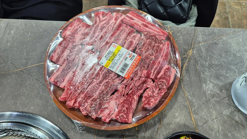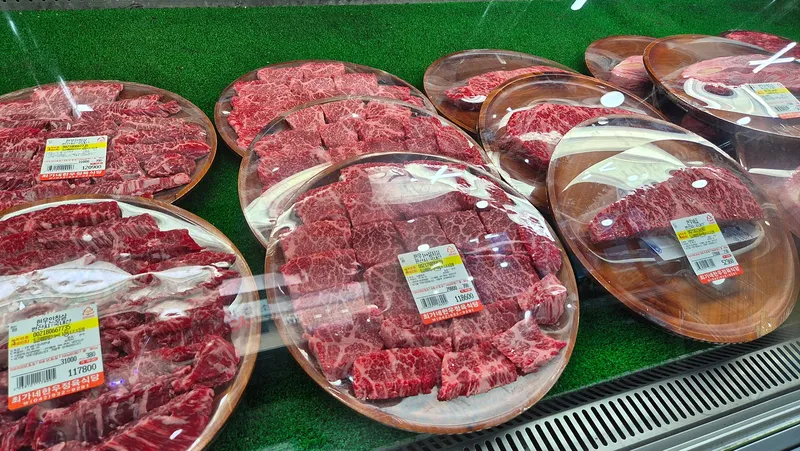 정육매대에는 등심, 갈비살, 안창살, 살치살 등 다양한 한우 부위가 소량씩 신선하게 진열되어 있었습니다. 많은 양을 진열하기보다는 그때그때 공급하는 듯한 느낌이었고, 그래서인지 고기의 신선도도 상당히 좋아 보였습니다.