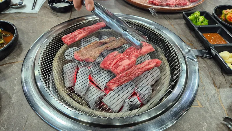 불판 위에 올린 한우는 숯불 화력 덕분에 빠르게 익었고, 갈비살 특유의 육즙과 고소한 향이 입안 가득 퍼졌습니다.