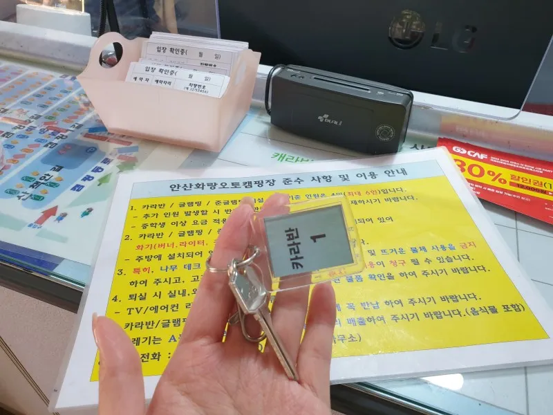 신분증 확인 후 키와 안내사항 종이를 받아야 해요.