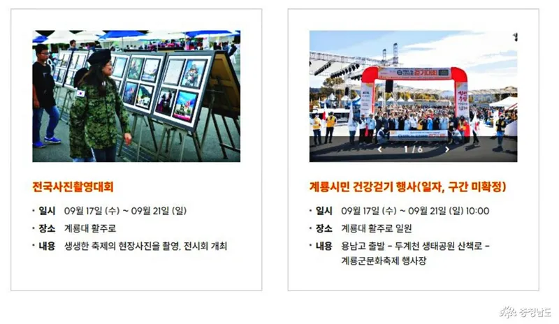 축제 기간동안 전국사진촬영대회와 계룡시민 건강 걷기 행사 등 관광객과 시민 그리고 사진작가들 참여 행사 등 다양한 체험과 문화 행사가 진행됩니다. (자료 - 계룡시 홈페이지 켭쳐)