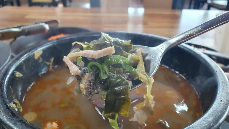 저는 식당에 도착하기 전까지 약 2시간을 야외에서 취재를 진행했던터라 음식을 기다리는 시간이 곧 휴식시간이었는데요, 충분한 휴식을 즐기기도 전에 갖가지 반찬과 더불어 펄펄끓는 뚝배기에 담긴 먹음직스러운 해장국이 식탁에 차려지기 시작합니다. 안그래도 푸짐한 식사인데, 여기에 솥밥까지 함께 곁들여지니 간단한 식사를 위한 밥상이 푸짐한 한정식집 밥상이 되는 기분이었습니다. 양평돌솥해장국의 해장국은 우리가 익히 먹어온 그런 평범한 맛의 해장국이지만, 오랜 시간과 정성으로 만들어진 음식임을 한 숟가락만으로도 느낄 수 있었던 맛있는 식사였습니다. 먹어도 먹어도 줄지않는 푸짐한 해장국과 더불어 갓지은 밥, 그리고 솥밥안의 따듯한 누룽지까지. 여러분들도 조종면 입구에 위치한 양평돌솥해장국에서 겨울철 든든한 식사를 즐겨보시길 바라며 맛있게 먹었던 가평식당후기를 모두 마치도록 하겠습니다.