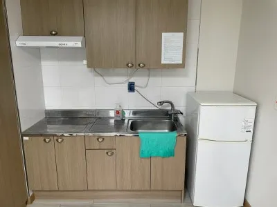 키를 받아 방으로 들어오면 원룸 형태의 방을 확인할 수 있는데요. 저희가 이번에 예약한 방은 나래관입니다. 천장에 시스템 에어컨이 있는데 아직 덥지 않아서인지 작동은 되고 있지 않더라고요. 주방 서랍장 안에는 인덕션과 냄비 등이 있고 냉장고도 잘 작동하고 있습니다. 이번 연휴에는 비가 내려서 날이 좀 쌀쌀하여 보일러를 틀어놓고 지냈어요.