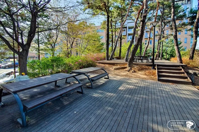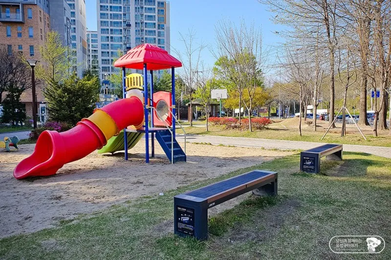 간단한 음식을 가지고 와서 먹을 수 있는 의자와 테이블도 설치되어 있으며 소나무숲으로 걸어가는 산책길도 따로 마련되어 있어 어린이공원이지만 여러가지를 한꺼번에 즐길 수 있습니다.
