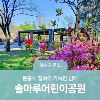 벚꽃이 지고 나니 다시 분홍색의 철쭉이 우리의 눈을 즐겁게 해 주는데요, 봄이라 미세먼지로 요즘 다시 마스크를 쓰고 있지만 공기 좋은 날, 한낮에 가까운 공원에 나와 따스한 봄나들이를 즐겨보시는 건 어떠세요? 요즘 가까운 공원에는 시민을 위한 여러 가지 휴식공간이 잘 조성되어 있는데요, 오늘은 유성구에 있는 솔마루어린이공원을 소개해 드리겠습니다.