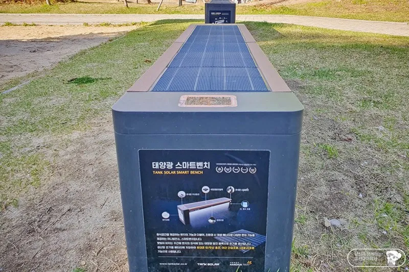 유아 놀이기구 옆에 있는 의자는 그냥 의자가 아닌 태양광 스마트벤치인데요, 태양광 발전 블록으로 전기를 생산하여 배터리에 저장, 휴대폰 유/무선 충전, 야간 간접조명, CI(광고) 조명 기능으로 사용할 수 있다고 합니다. 그래서 의자 옆에 휴대폰을 놓고 충전을 해보니 정말 충전이 되더라고요.