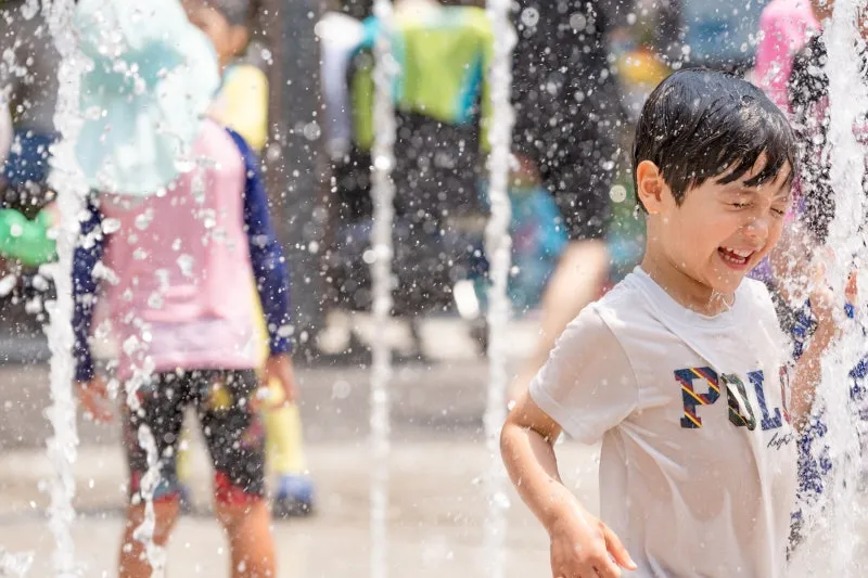 물보라 사이를 뛰노는 어린이의 모습이