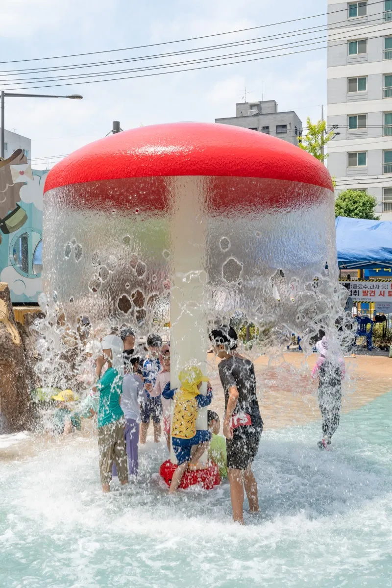 버섯분수에서도 시원한 물이 쏟아져 내립니다.