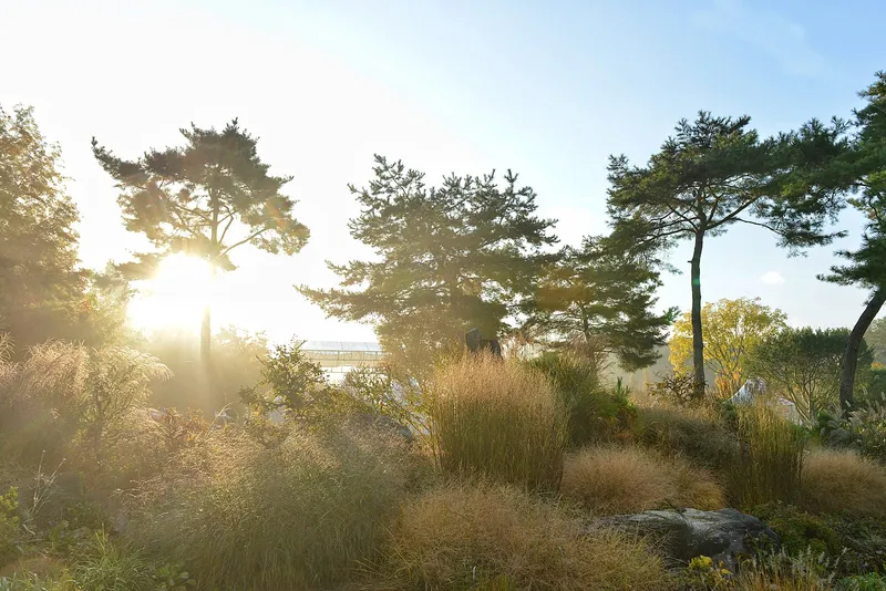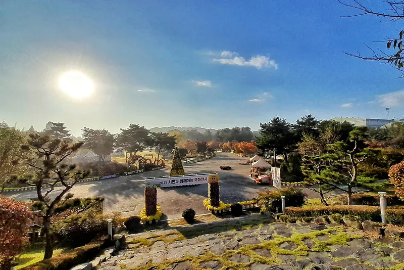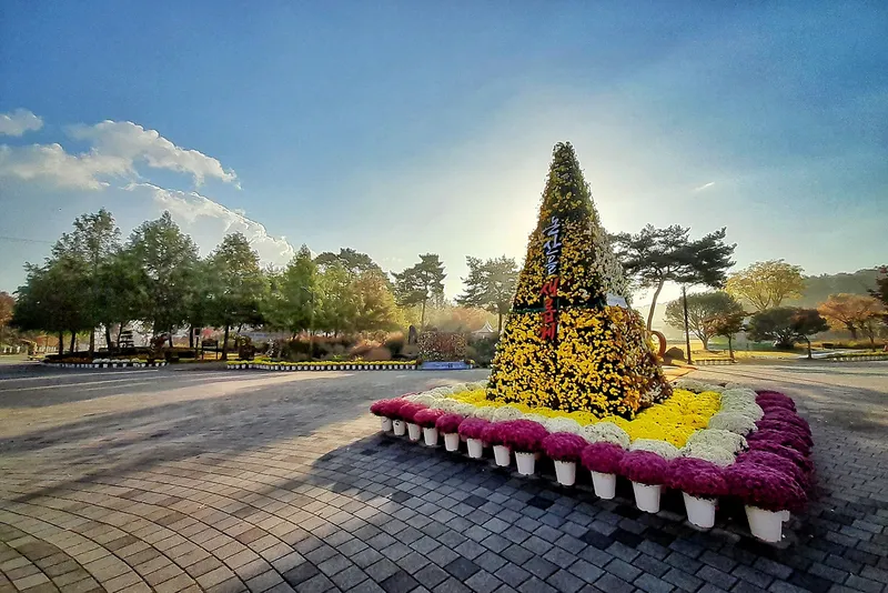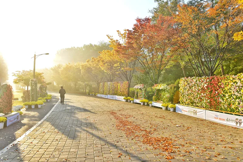 아침에는 논산시민가족공원의 멋진 풍경과 국화가 조화를 이루어 더 아름다운 모습을 볼 수 있습니다.
