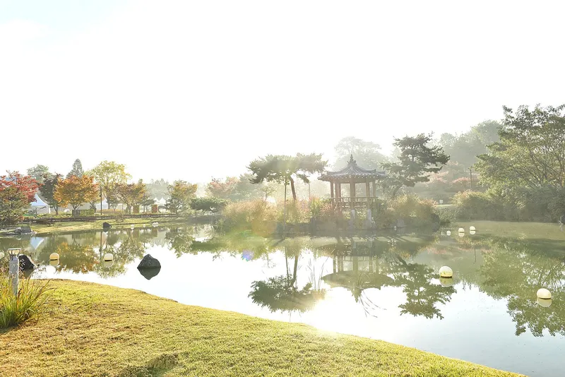 거울 연못은 떠오른 햇빛을 머금고 아름다운 풍경을 만들어 줍니다.