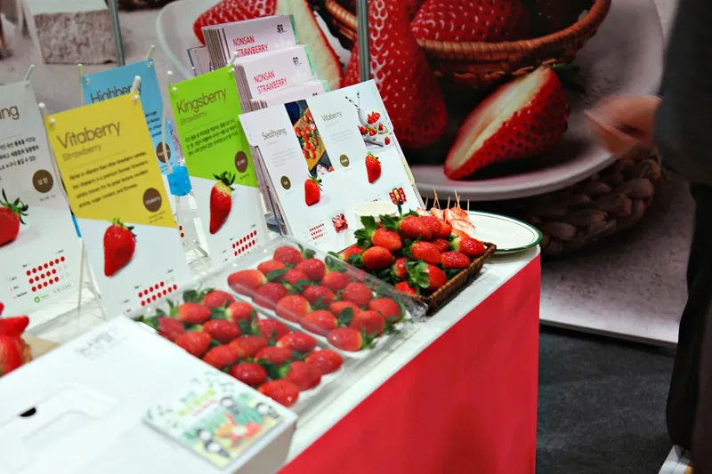 논산딸기, 논산딸기는 지금도 더 좋은 품질과 맛을 위해 연구개발에 노력하고 있으며 그 성과는 매년 더 많은 생산과 매출로 증명되고 있습니다. 논산딸기 시식하며 딸기 이야기를 빨간 딸기색같이 정열적으로 외국 바이어에게 설명하는 논산시장 모습입니다.