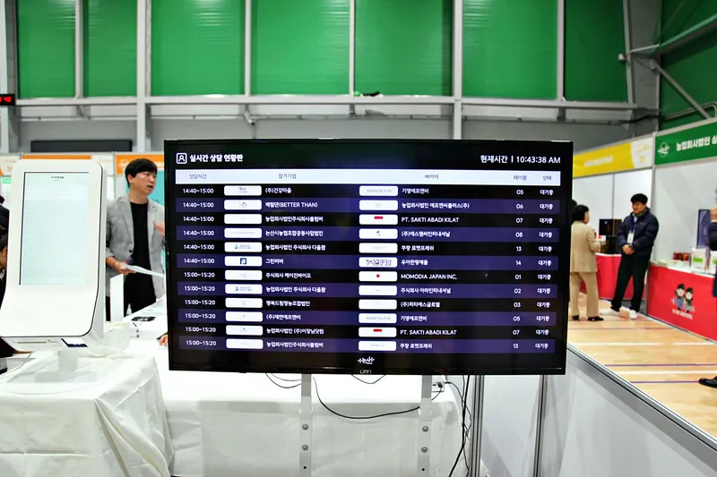 구매상담 테이블과 의자가 설치된 중앙 공간 입구에 설치된 대형 모니터에는 참가 기업과 생산농가들의 상담시간과 바이어 그리고 상담테이블 번호가 올라와 있습니다.