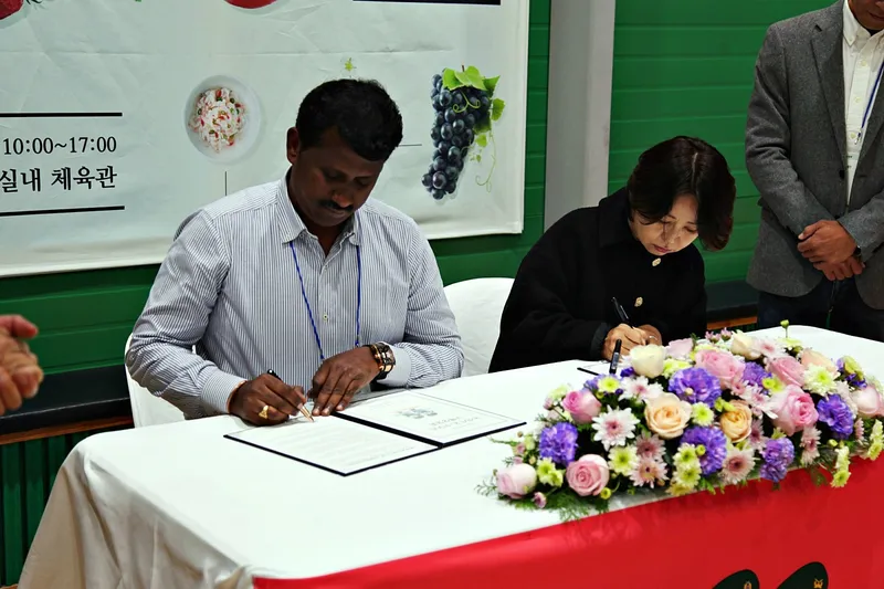 논산시 K - FOOD 구매상담회에서 외국인 바이어와 논산시 생산업체와 구매계약서에 서약하는 모습도 담았습니다. 우수한 논산시 생산 농산물과 다양한 제품의 홍보와 구매상담으로 많은 계약이 이루어지기를 응원하였습니다.
