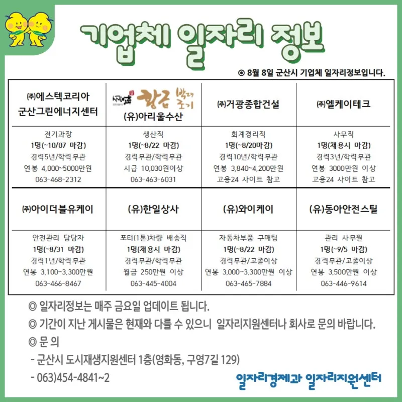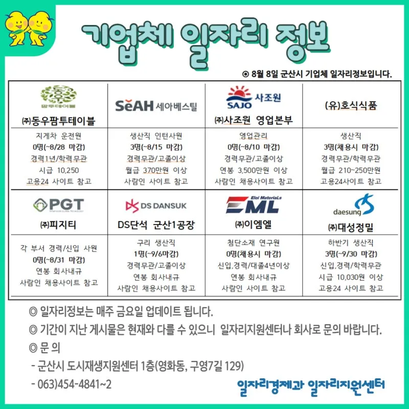 8월 8일 군산시 기업체 일자리 정보 입니다.