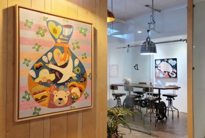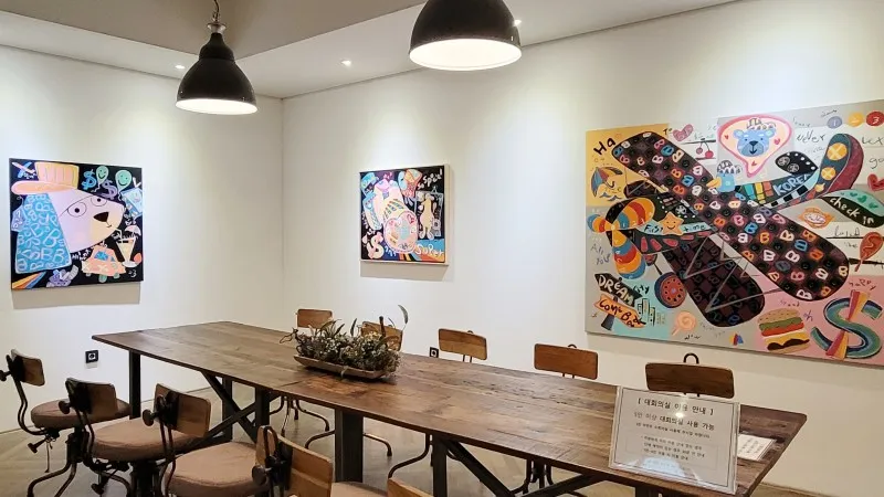 여러 명이 함께 이용하는 회의실 공간에도 작품이 걸려 있습니다. 그중에서도 열 명이 들어갈 수 있는 대회의실에는 네 작품이나 걸려 있습니다. 이곳은 갤러리로 운영되는 곳이니 가능하면 공간을 비워 달라고 요청하는 내용이 있습니다.