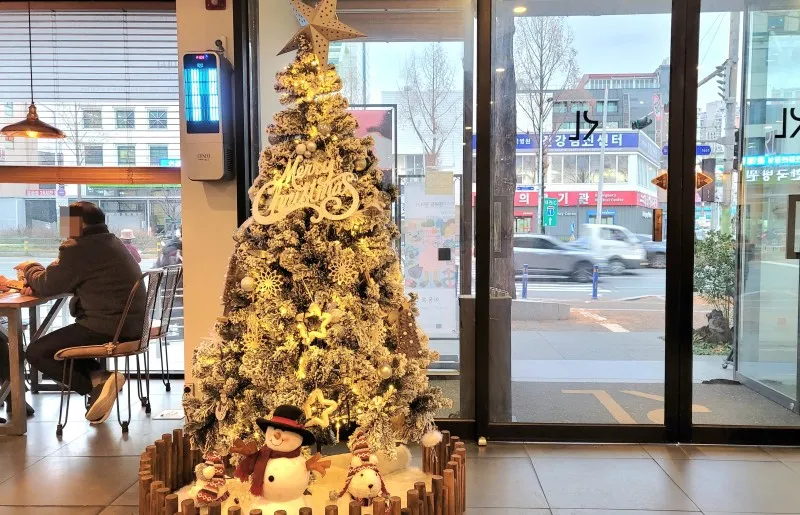 레드엘갤러리 입구 안쪽에는 커다란 장식 트리가 놓여 연말 분위기를 느낄 수 있습니다.