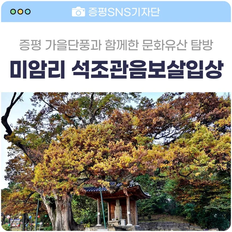 가을 단풍을 즐기고 싶던 날 미암리 석조관음보살입상을 찾았습니다. 미륵사와 지척에 위치한 미암리 석조관음보살입상은 증평 읍내에서 가볍게 찾을 수 있는 문화유산이네요. 300년 수령의 보호수와 나란히 하고 있어 가을이면 아름다운 단풍도 즐기게 됩니다.