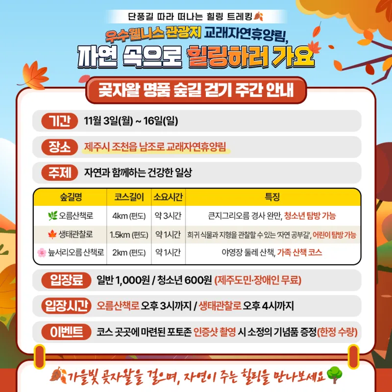 교래자연휴양림 가을빛 물든 곶자왈 명품 숲길 걷기주간!