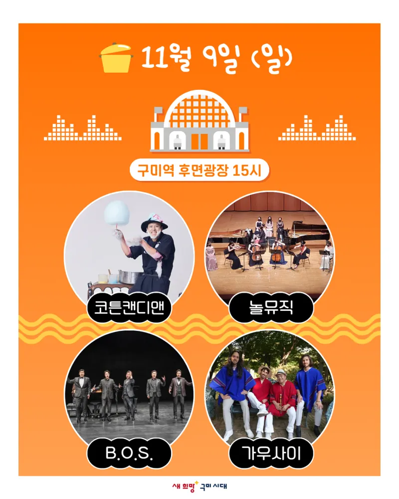 구미역 후면광장과 각산살롱에서 솜사탕 퍼포먼스, 클래식, 인디음악 등등 다양한 장르의 풍성한 공연이 펼쳐집니다. 많은 관심 부탁드립니다.