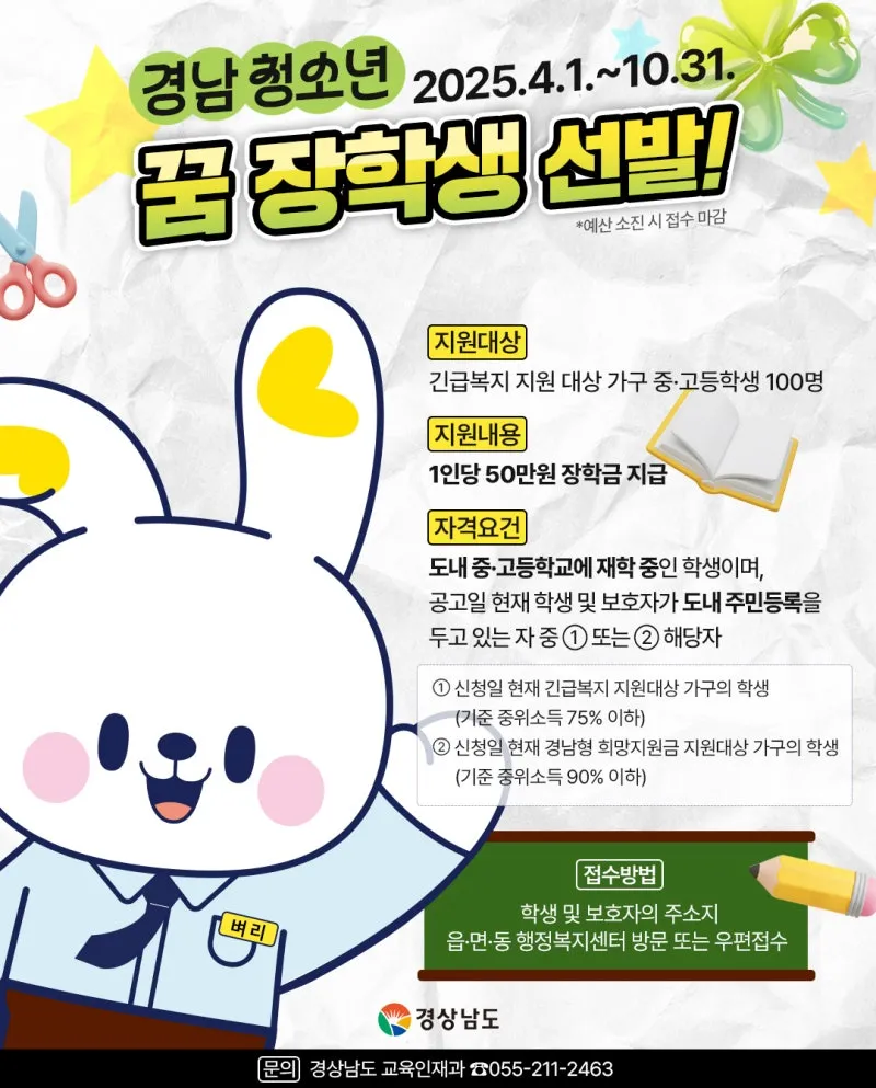 경상남도는 도내 서민자녀의 안정적인 생활을 돕고 우수한 인재를 양성하기 위해 ‘2025년 경상남도 청소년 꿈 장학사업’을 시행합니다. (재)경상남도장학회를 통해 청소년 꿈 장학금 지급사업과 청소년 영어캠프 사업으로 추진됩니다.