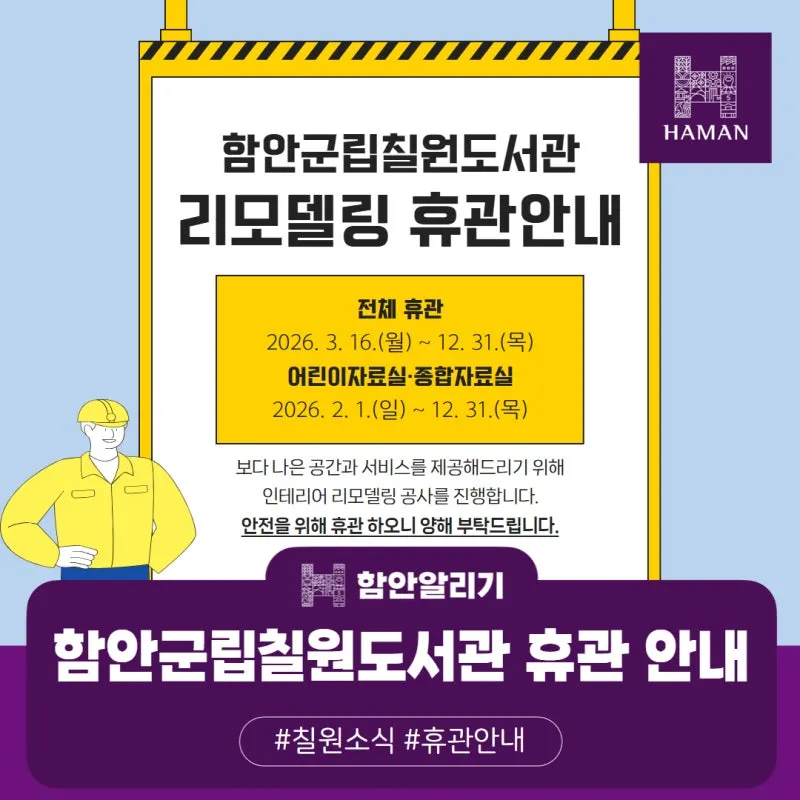 #칠원도서관 #함안군립도서관 #도서관휴관안내 #도서관리모델링