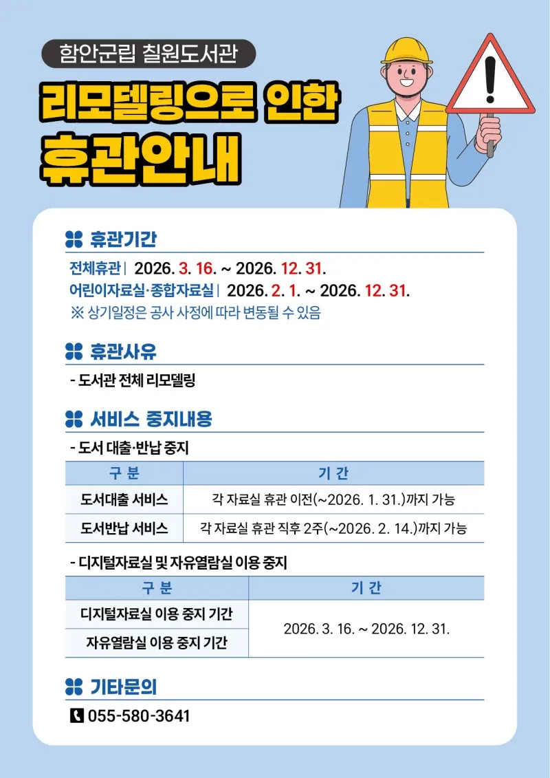 칠원도서관 전체 리모델링 공사로 인한 임시 휴관