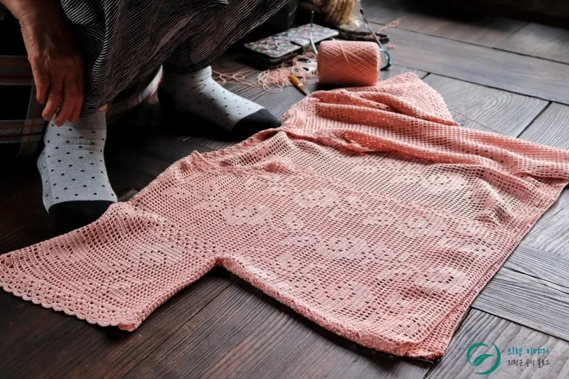 시원한 음료를 마시는 중에 과일도 내오겠다 하시면서 또 부지런히 어디론가 다녀오시더니 이번에는 사과며 참외며, 토마토를 담아 오셔서는 깎아주시면서 이런 얘기 저런 얘기를 나누는 중에 뜨개질하고 계시던 것이 예사롭잖게 보여 여쭸더니 의령예술촌에 출품할 작품을 뜨고 계신다는 것입니다.