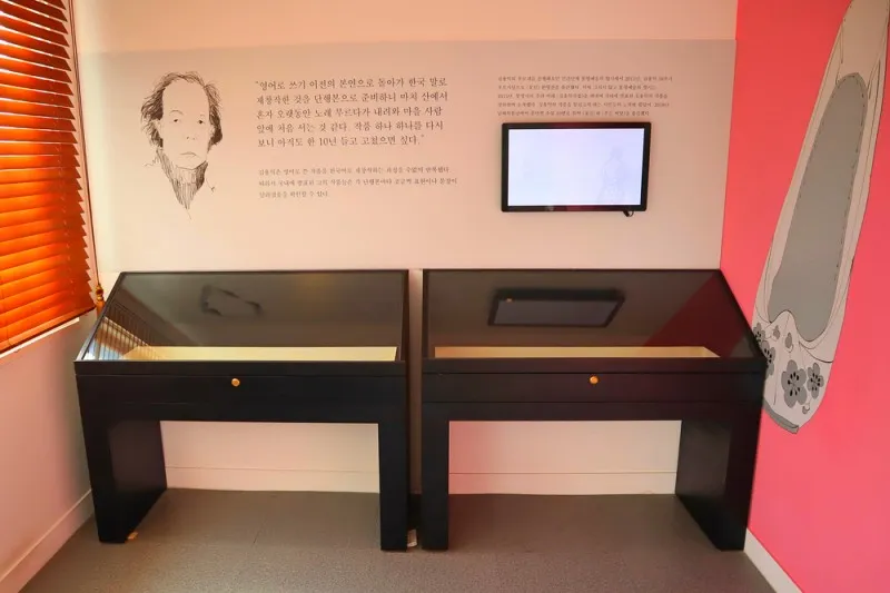기념관으로 들어가면 동생이신 재미 소설가 김용익 선생의 작품이 전시되어 있습니다. 김용익은 교수와 작가로 활동하면서 독자적으로 자신의 길을 개척하셨습니다. 바다의 땅 통영에서의 유년 시절에 대한 기억을 소재로 삼아 영어로 소설을 쓰셨고 다시 우리말로 번역하는 재창작을 통하여 세계에 자신의 작품을 알리셨습니다.
