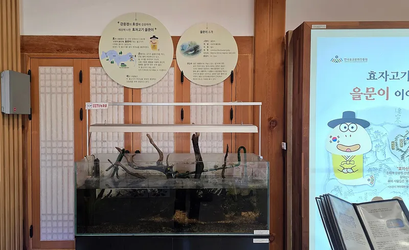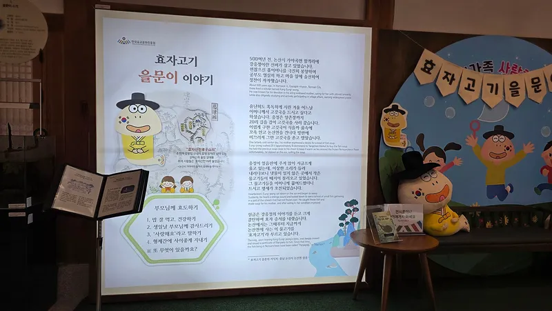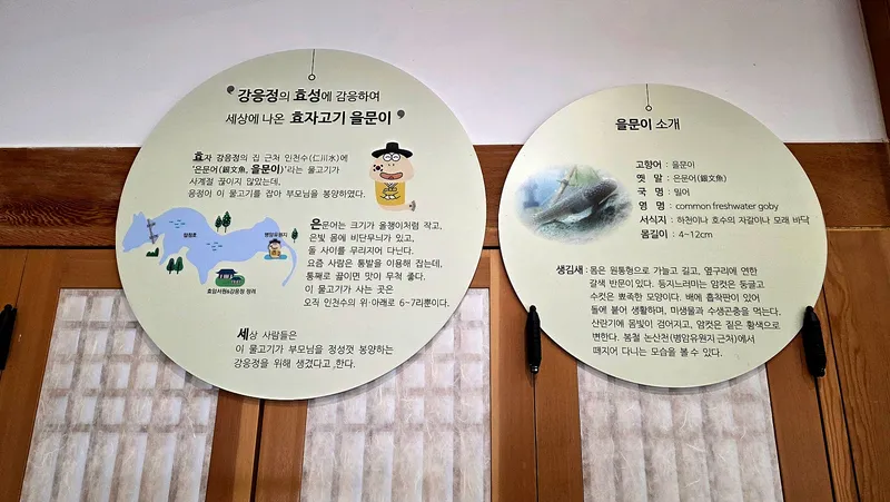 논산천의 효자 물고기인 을문이 고기가 유교의 이념인 충효예를 소개하고 있습니다.