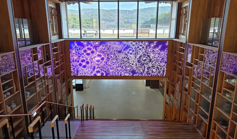 좌우로 전통 공예 작품을 전시하고 있고 정면의 대형 화면에서는 아름다운 영상을 볼 수 있습니다.