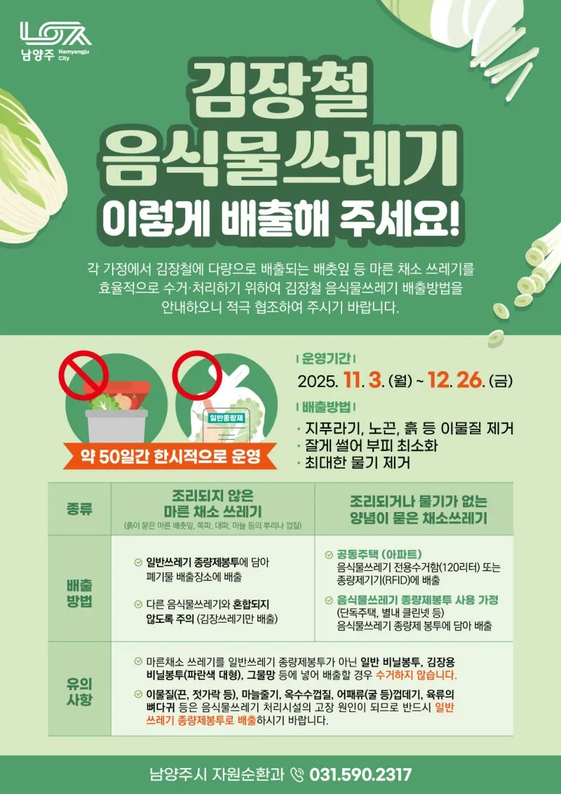 - 일반쓰레기 종량제봉투에 담아 폐기물 배출장소에 배출 - 다른 음식물쓰레기와 혼합되지 않도록 주의 (김장쓰레기만 배출) |