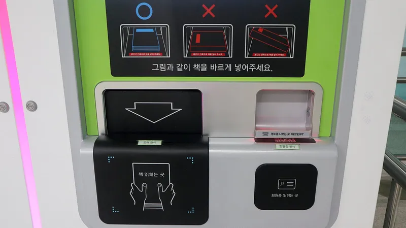 하단의 센서들을 통해 책을 스캔하거나 회원증을 인식할 수 있습니다.
