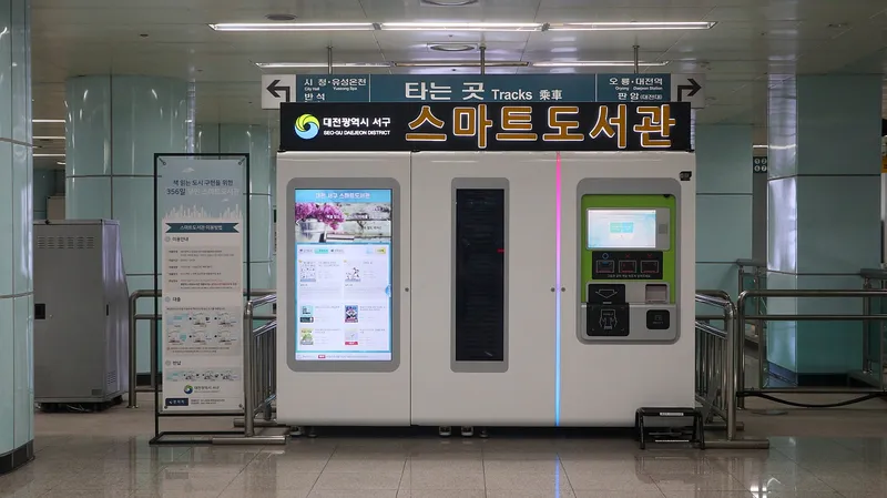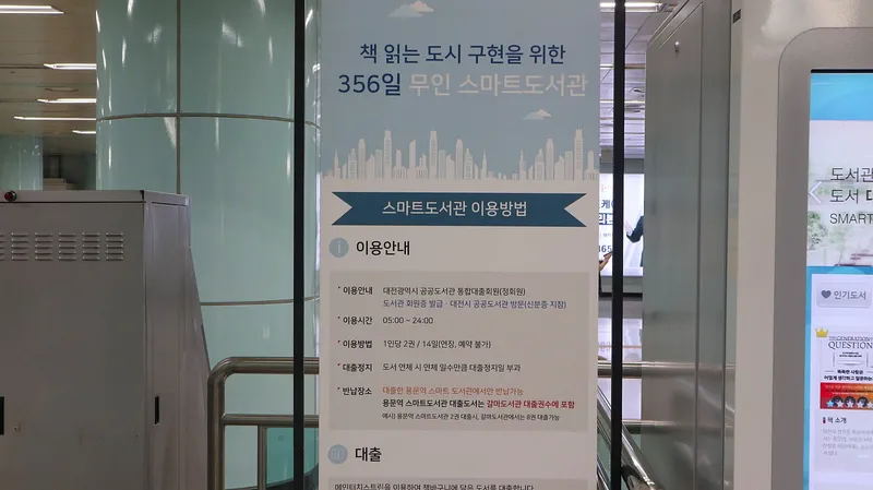 대전광역시 서구 도안동 행정복지센터와 용문역 역사 내 두 곳에 '스마트도서관이 설립되었습니다. 특히 용문역 안에 위치한 '스마트도서관'은 대전 최초의 무인 도서대출 및 반납시스템을 갖춘 공간입니다.