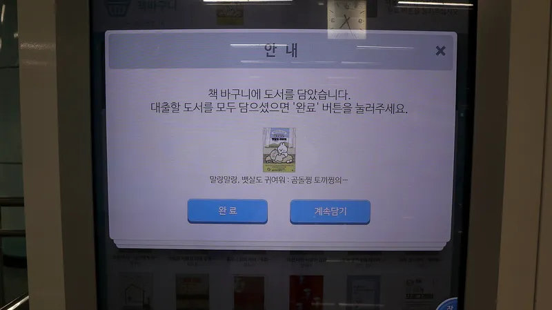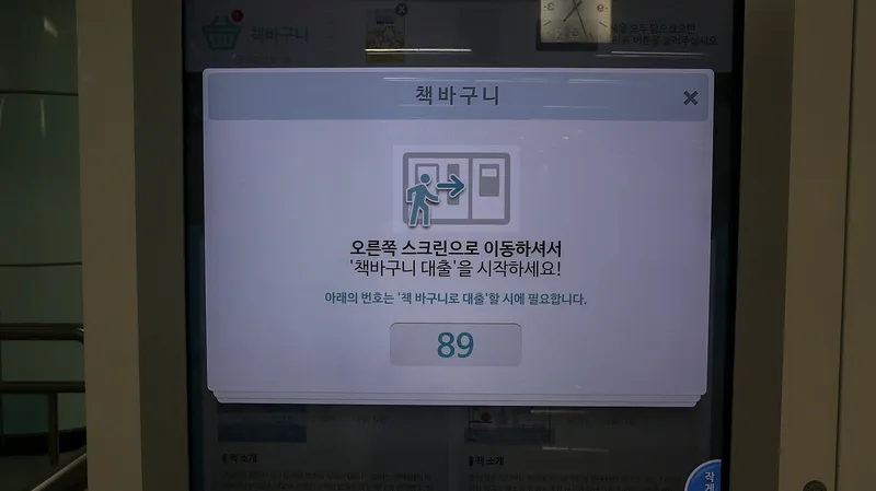 장바구니에 도서를 담고 완료 버튼을 누르면 오른쪽 스크린으로 이동하여 장바구니 대출을 시작하면 됩니다.